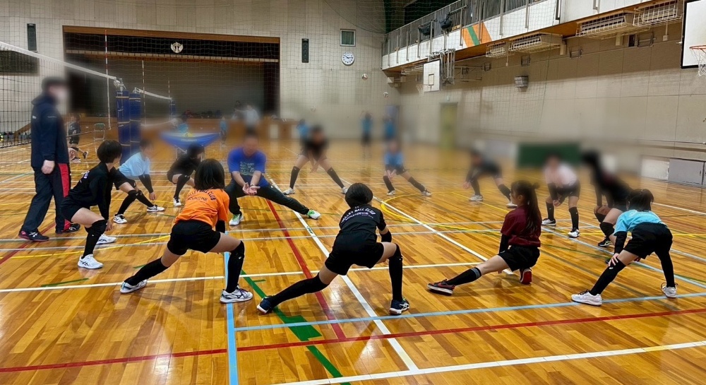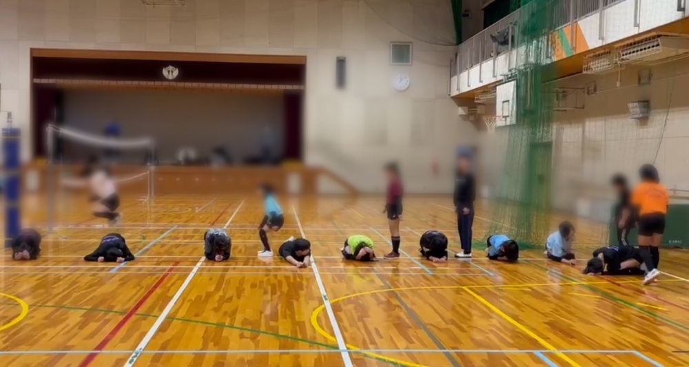 その後、レシーブに必要な「下半身の作り方」をテーマに、腰の落とし方、構えの安定、起き上がってしまわない姿勢づくりなどを、時間をかけて丁寧に確認しました。