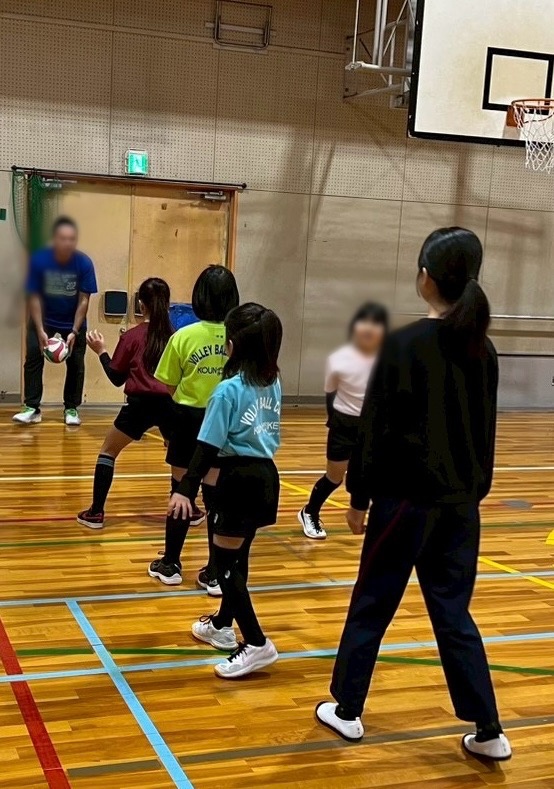 途中からは低学年グループの基本練習にも混ざり、パスやレシーブなどを体験してもらいました。